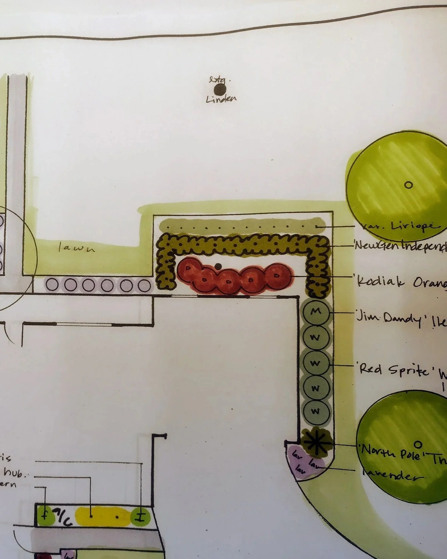 This is an A-typical landscape plan with its formal straight bed lines in the formal front yard. It does loosen to curvilinear bed lines around the sides and backyard of this home.